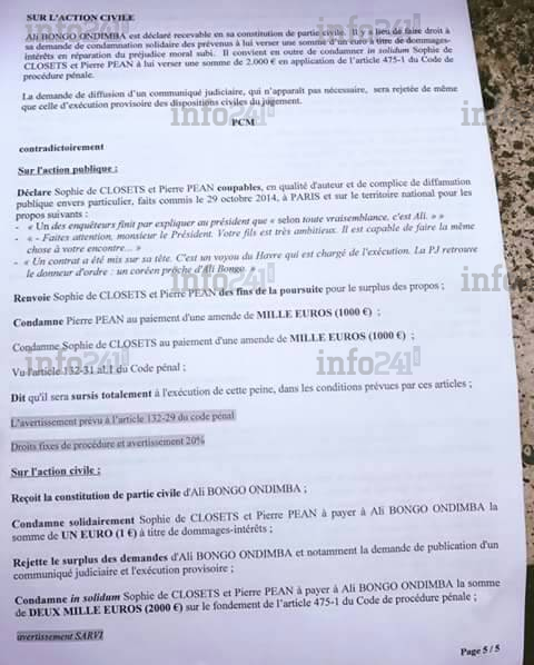 Après deux années de procédures, Ali Bongo et sa nouvelle avocate Delphine Meillet ont enfin eu gain de cause dans l’affaire qui les opposait à l’écrivain Pierre Péan. Le procès qui n’a aucunement porté sur le principal point d’orge du livre, la filiation prétendument biafraise d’Ali Bongo, a condamné l’auteur et son éditrice Sophie de Closets à payer chacun une amende de 1.000 € soit 650.000 F.CFA et 1 euro à Ali Bongo en guise de dommages-intérêts.