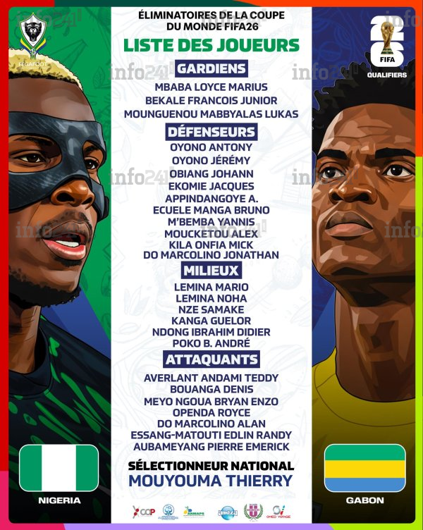 L’attaque sera naturellement menée par les stars internationales, Pierre-Emerick Aubameyang et Denis Bouanga. Il est important de noter que le défenseur Mick Kila Onfia (24 ans, sociétaire du Hafia FC en Guinée-Conakry), bien que convoqué, sera malheureusement suspendu pour le match contre le Nigeria, obligeant le staff à pallier cette absence. La répartition des 26 joueurs convoqués par poste est la suivante : 3 gardiens, 10 défenseurs, 6 milieux et 7 attaquants.