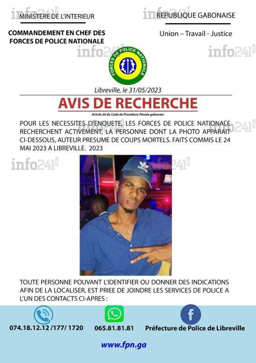 « Toute personne pouvant l’identifier ou donner des indications afin de le localiser, est priée de joindre les services de police à l’un des contacts ci-après : 074.18.12.12 ou par WhatsApp au 065.81.81.81 », sollicite la police. L’article 233 du Code pénal gabonais stipule que « l’homicide commis volontairement est qualifié de meurtre. L’auteur de meurtre est puni de trente ans de réclusion criminelle et d’une amende de 20 millions de francs CFA au plus ».