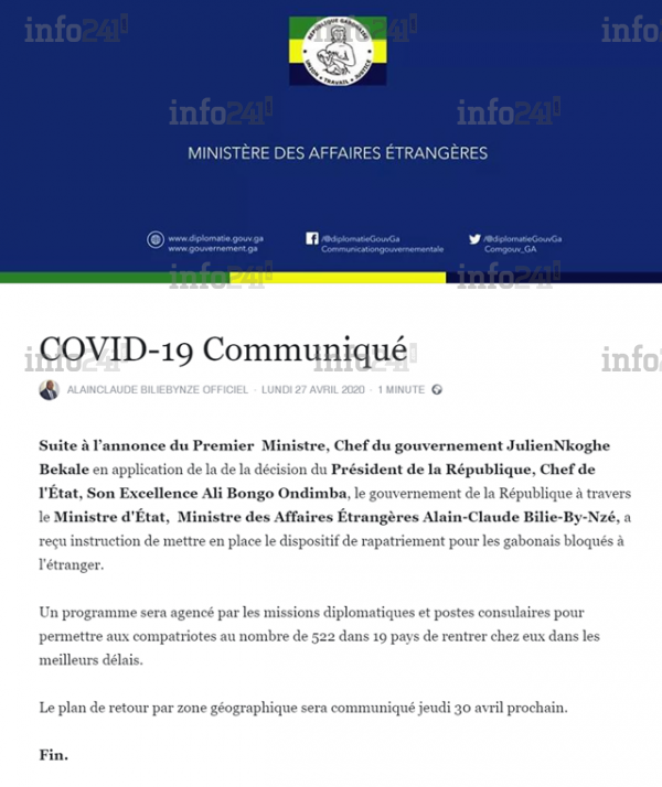 Le communiqué de ce lundi annonçant pour ce jeudi, le programme de rapatriement de gabonais