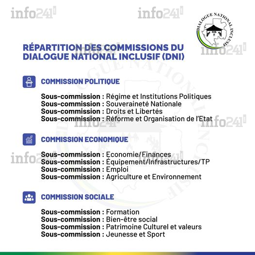 Le président de la transition a augmenté le nombre de participants de 542 à 600 et les a répartis en trois grands groupes appelés commissions selon le décret n°0146/PT-PR/MRI du 29 mars 2024 portant modification du décret n°128Bis/PT-PR/MRI du 26 mars 2024 portant désignation des participants au Dialogue National Inclusif. La commission politique, présidée par le Pr. Noel Bertrand Boudzanga, se compose des 4 sous-commissions suivantes : régime et institutions politiques, souveraineté nationale, droits et libertés, et enfin, réforme et organisation de l’État.