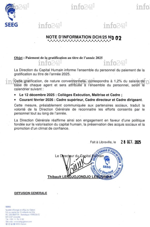 La nouvelle a de quoi surprendre. Alors que la population gabonaise endure les délestages électriques à répétition et les pénuries d’eau persistantes, la Société d’énergie et d’eau du Gabon (SEEG) a annoncé le versement d’une prime de gratification équivalente à 1,2 % du salaire de base à l’ensemble de son personnel. La décision, officialisée dans une note d’information n° 002 signée le 28 octobre 2025 par le directeur du capital humain, Thibault Lendjojondjo Lebounda, provoque de vives réactions dans l’opinion, déjà exaspérée par les failles chroniques du service public.