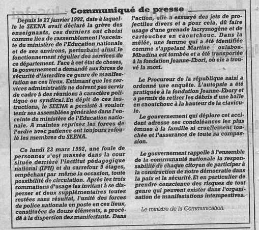 Le 23 mars 1992 au cours d’une marche syndicale à Libreville, la police gabonaise n’aura pas rechigné à arracher la vie à Martine Oulabou Mbadinga. L’enseignante assassinée revendiquait avec ses camarades de meilleures conditions d’apprentissage et d’études pour l’Ecole gabonaise. Ce meurtre resté non-élucidé jusqu’à nos jours, marque depuis la commémoration de la journée nationale de l’enseignant gabonais, célébrée depuis 2007 chaque 23 mars. Retour cet assassinat commandité par le régime d’Omar Bongo qui tentait ce jour-là, de conjurer un soulèvement populaire.
