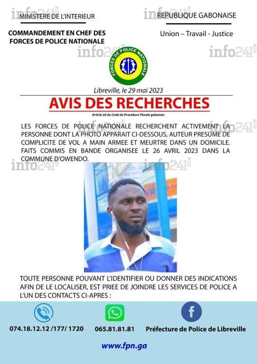 Des faits commis en bande organisée avec d’autres présumés criminels. C’est le mercredi 26 avril dernier, que le drame a été découvert. La découverte du cadavre dans avait été faite dans la banlieue d’Owendo dans son domicile. À ce jour le mystère demeure entier. Le parquet de Libreville a ouvert une enquête pour homicide volontaire. « Pour les nécessités d’enquête, les Forces de police nationale recherchent activement la personne dont la photo apparait ci-dessous, auteur présumé de complicité de vol à main armée et meurtre dans un domicile. Faits commis en bande organisée le 26 avril dernier à Owendo », informe l’avis de recherche.