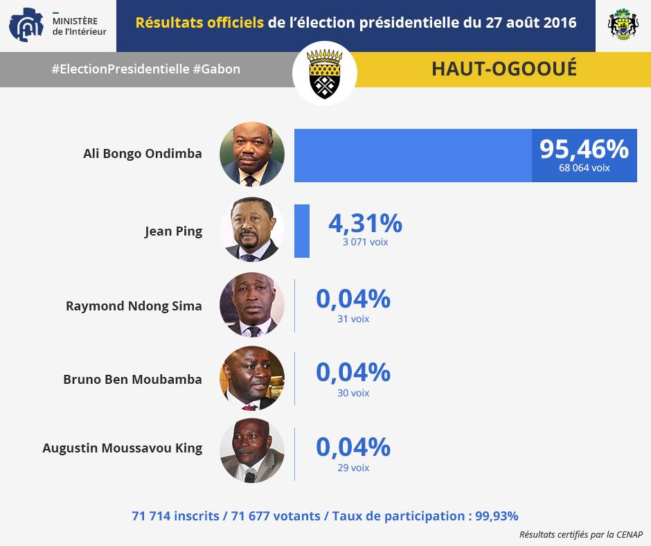 Jusqu’au 30 août 2016, seuls les résultats de la province du Haut Ogooué n’étaient pas communiqués alors que le dépouillement avait été effectué le 27 août dans la soirée. Sans les résultats du Haut-Ogooué qui n’étaient pas communiqués alors que tous les autres étaient connus, Jean Ping était en avance d’un peu plus de 60.000 voix, mais c’était sans compter sur les talents avérés de faussaire de son adversaire.