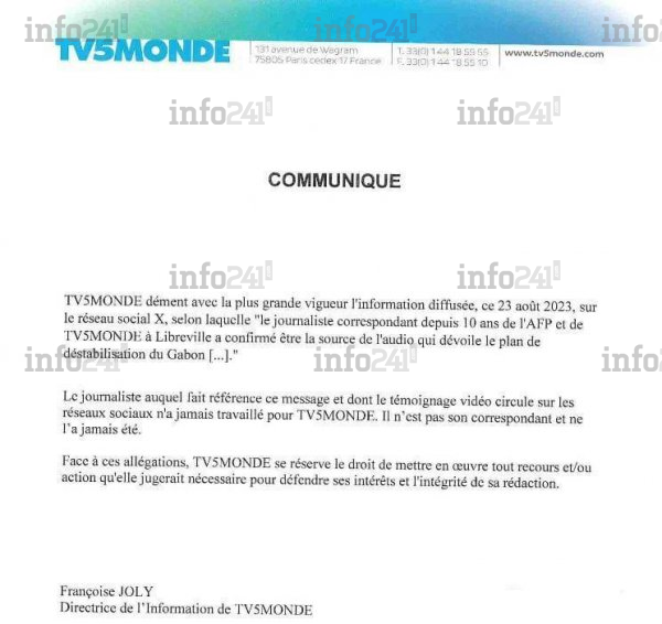 Sauf que dans un communiqué de TV5Monde, le fameux correspondant depuis 10 ans de l’AFP et de France24 comme l’a souligné le porte-parole de la présidence gabonaise Jessye Ella Ekoha sur Twiter, est inconnu au bataillon. « TV5MONDE dément avec la plus grande vigueur l’information diffusée, ce 23 août 2023, sur le réseau social X selon laquelle le journaliste correspondant depuis 10 ans de l’AFP et de TV5MONDE à Libreville a confirmé être la source de l’audio qui dévoile le plan de déstabilisation du Gabon », précise la chaîne.