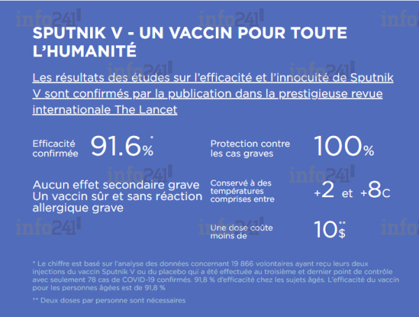 « Spoutnik V est très demandé dans le monde et de plus en plus de pays africains sont prêts à l’acheter car le vaccin russe est l’un des meilleurs au monde », a déclaré le président du Fonds russe RDIF, Kirill Dmitriev. Avant d’ajouter : « Spoutnik V constituera une partie importante du portefeuille national de vaccins du Gabon grâce à une efficacité de plus de 90%, une sécurité, une plateforme éprouvée, une distribution facile et un certain nombre d’autres avantages ».
