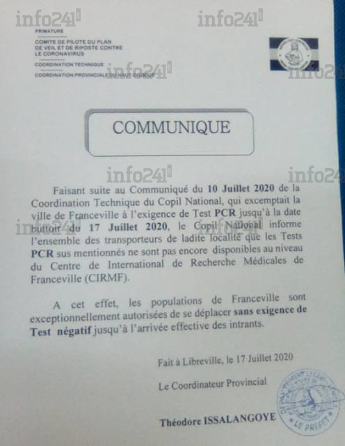 Ainsi, l’entrée en vigueur de la mesure devra encore attendre que les autorités fournissent au comité local les moyens de déployer des tests de dépistage pour les populations désireuses de voyager. Selon un communiqué du coordinateur provincial du Copil Coronavirus, Théodore Issalangoye, « les populations de Franceville sont exceptionnellement autorisées à se déplacer sans exigence de test négatif jusqu’à l’arrivée effective des intrants ».