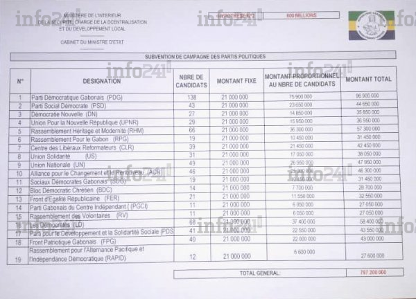 Selon un document dont s’est procuré Info241, ce sont 19 partis qui « présentent au moins 10 candidats dans au moins cinq provinces pour les législatives » qui sont appelés à la caisse pour percevoir leur franc électoral. Celui-ci serait de 21 millions minimum, auxquels s’ajoutent une subvention définie au prorata du nombre total de candidats à ces joutes électorales. Ce qui fait un pactole total de 797,2 millions !