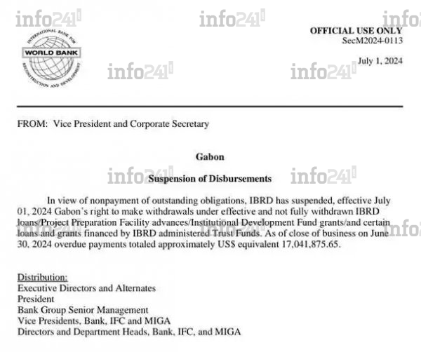 Cette suspension représente un coup dur pour le Gabon, dont les financements de développement sont cruciaux pour divers projets nationaux. Les autorités gabonaises sont désormais confrontées à la tâche urgente de régler ces arriérés pour rétablir l’accès aux fonds vitaux pour le développement économique et social du pays. La lettre confidentielle dont s’est procurée Info241, classifiée sous « USAGE OFFICIEL UNIQUEMENT, » a été envoyée aux directeurs exécutifs et suppléants, au président, à la haute direction du Groupe de la Banque mondiale, et aux vice-présidents ainsi qu’aux chefs de départements de la Banque, IFC et MIGA.