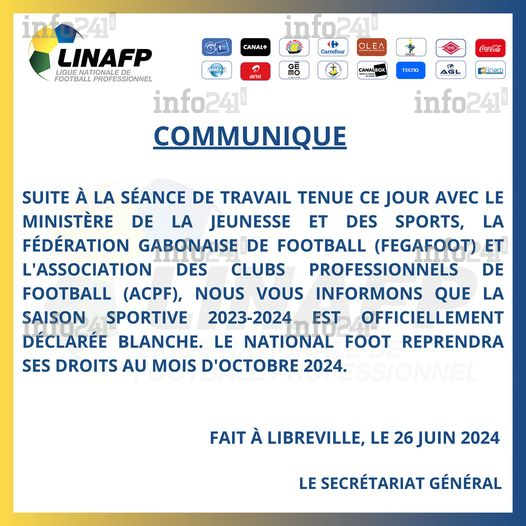 « La saison sportive 2023-2024 est officiellement déclarée blanche », a déclaré hier la Linaf dans son communiqué parvenu hier à la rédaction d’Info241. La déclaration d’une saison blanche signifie que les compétitions prévues pour cette période sont annulées. En conséquence, aucun champion de première et de deuxième divisions ne sera désigné.