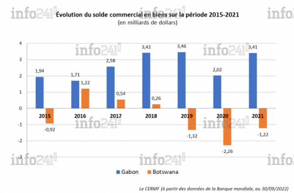 Ce processus de diversification a également contribué à accroître l’excèdent commercial du pays, passé de 1,9 à 3,4 milliards de dollars entre 2015 et 2021 (toujours selon la Banque mondiale), alors que le Botswana peine désormais à enregistrer un solde commercial positif, le pays étant en déficit depuis 2019 (et l’ayant aussi été en 2015). Sur la période de sept années allant de 2015 à 2021, le Gabon a ainsi réalisé un excédent commercial de 2,6 Mds de dollars en moyenne annuelle, contre un déficit de 0,5 Md pour le Botswana. Les récentes mesures audacieuses prises pour la promotion de la production alimentaire locale, ou encore le doublement prochain de la part de la production locale de gaz butane (devant être protée à 40 % d’ici deux ans, en 2023), seront également de nature à accroître les excédents commerciaux de pays, à travers la réduction significative des importations en la matière. Au passage, il est à noter que la Chine est désormais le premier partenaire commercial du Gabon, dont elle a représenté 27 % du commerce extérieur en 2021 (et absorbé 33 % des exportations). Elle est suivie par la France, qui arrive en deuxième position avec une part de seulement 10 % du commerce extérieur, comme en 2020.