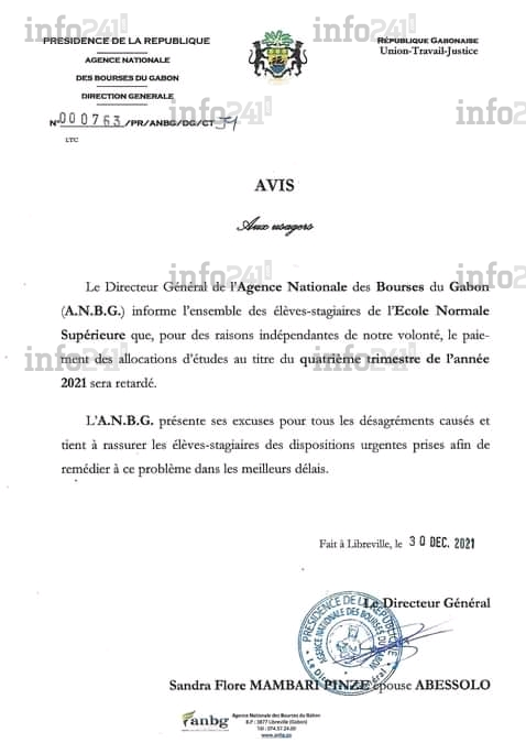 « Le directeur général de l’Agence nationale des bourses du Gabon (ANBG) informe l’ensemble des élèves-stagiaires de l’Ecole Normale supérieure que, pour des raisons indépendantes de notre volonté, le paiement des allocations d’études au titre du quatrième trimestre de l’année 2021 sera retardé », précise le communiqué signé de la directrice générale de l’organisme de bouse de l’Etat gabonais.