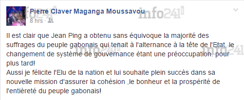 Jean Ping aurait remporté le scrutin présidentiel à un tour d’hier. C’est ce qu’indique un message posté par le candidat Pierre Claver Maganga Moussavou sur sa page Facebook. Reconnaissant sa défaite, le candidat a indiqué : « Il est clair que Jean Ping a obtenu sans équivoque la majorité des suffrages du peuple gabonais qui tenait à l’alternance à la tête de l’Etat ». Et d’ajouter : « Aussi je félicite l’Elu de la nation et lui souhaite plein succès dans sa nouvelle mission d’assurer la cohésion ,le bonheur et la prospérité de l’entièreté du peuple gabonais ! ».