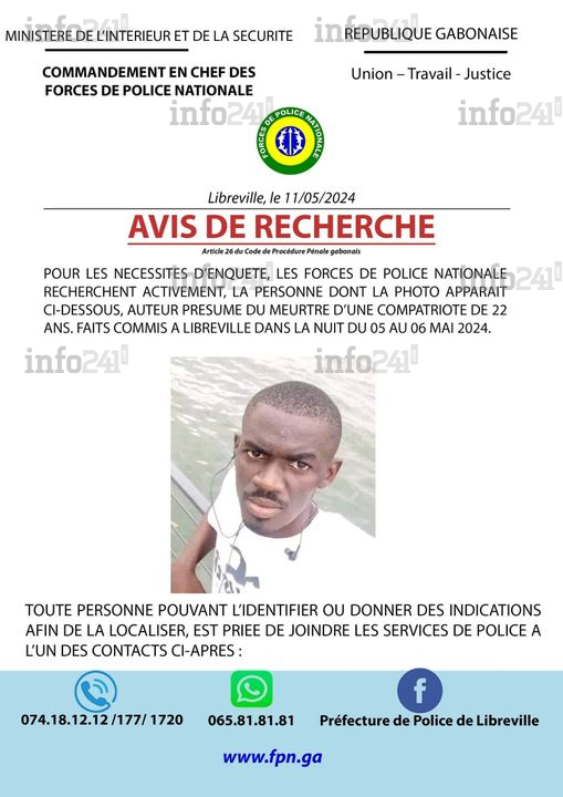 L’enquête autour du meurtre odieux de Florselia Mbakoudisa Koumba, une jeune étudiante Gabonaise de 22 ans retrouvée morte ce lundi soir à Libreville, serait en bonne voie de résolution. La police a diffusé ce samedi 11 mai une première photo du présumé meurtrier dans un avis de recherche pour collecter des informations à son sujet.