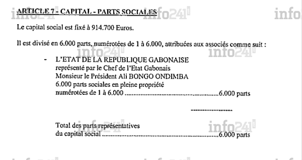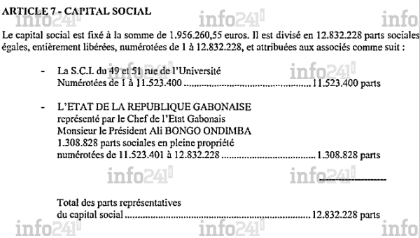 Il se trouve en effet que le 21 avril 2010 à Paris, soit près d’un mois avant le communiqué du gouvernement gabonais, les statuts de la SCI des Numéros 49 et 51, rue de l’université sont modifiés. L’article 7 desdits statuts indique que le capital social de la SCI est fixé à 914.700 € divisés en 6000 parts, soit 600.003.867 F CFA.