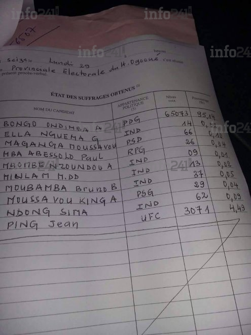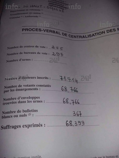Mais seule ombre au tableau, lorsqu’on regarde de plus près les résultats salvateurs du Haut Ogooué notamment le procès-verbal de centralisation des résultats de cette province, on est surpris de constater que le nombre d’électeurs inscrits est supérieur à celui de la liste électorale officielle du Ministère de l’Intérieur du Gabon soit 71.714 pour le Procès-Verbal (doc. Procès verbal 1 et 2) contre 71123 pour la liste électorale biométrique dite « projet iboga » (page 457 doc Liste CENAP).